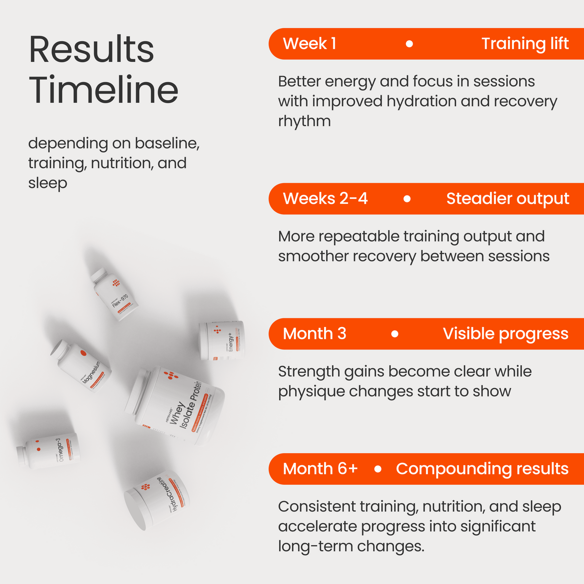 Many people feel the first difference in workout quality, they have better energy, focus, pumps, and next-day recovery. Visible physique changes typically show after consistent weeks of training and nutrition intake.